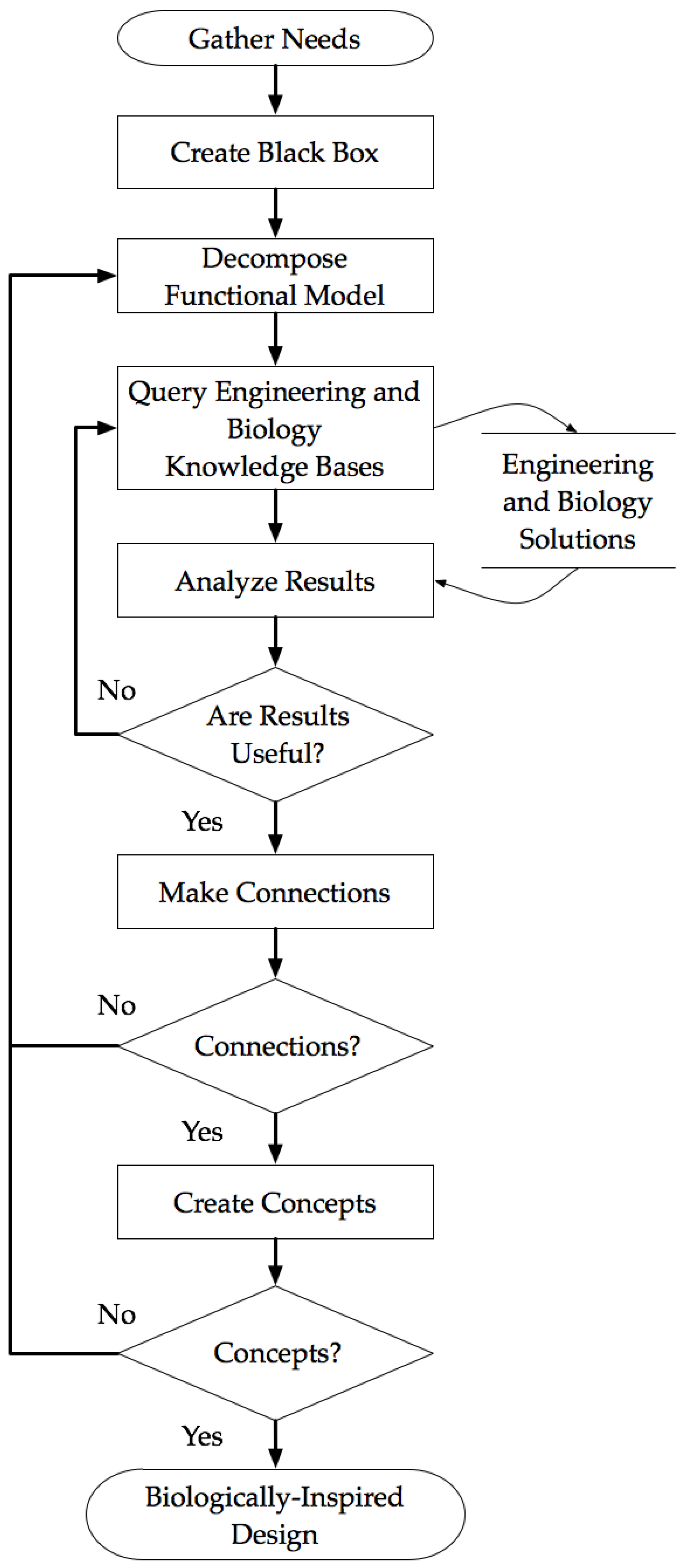 Although prescriptive, the design methodology is also versatile by providing a designer multiple avenues that lead to a biologically-inspired design [49]. One such avenue, stemming from a problem-driven perspective, is given in Figure 1. Following the flow chart of Figure 1 the designer is instructed to decompose a functional model from a black box model, resulting in a conceptual functional model. The conceptual functional model, which describes the desired functionalities of a solution rather than an existing solution, is used to query the engineering and biology knowledge bases. In the event that no connections can be formalized then the designer should return to the query step and try different levels of functions and flows. The same holds true for when no concepts are synthesized.