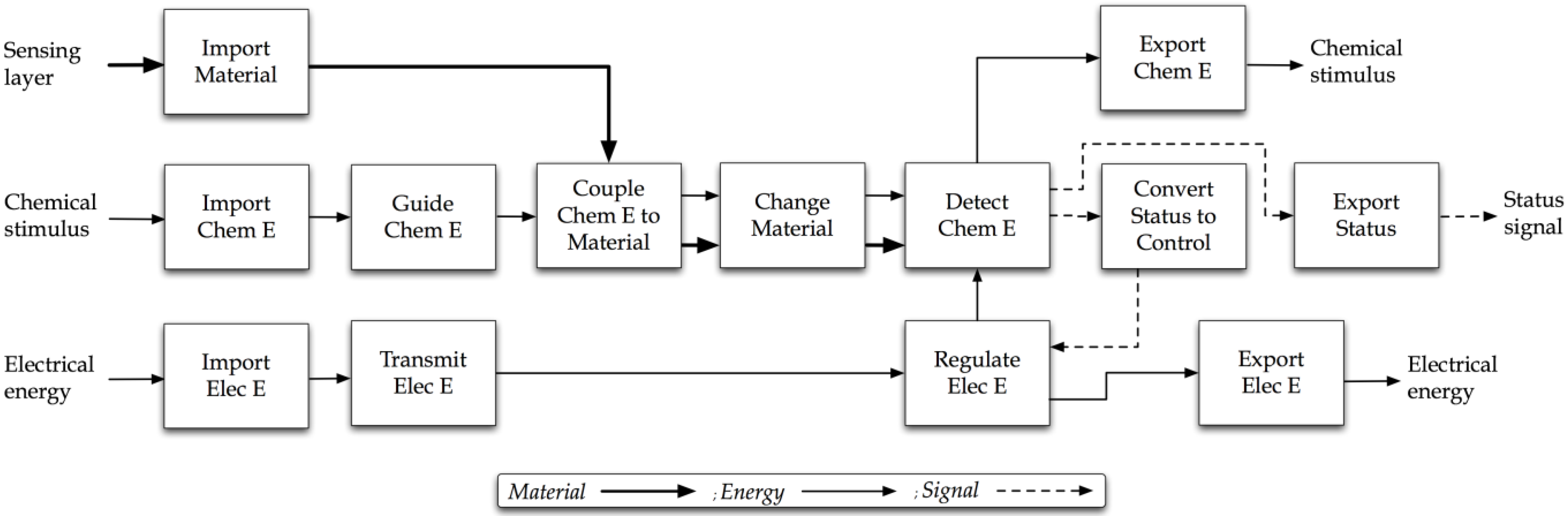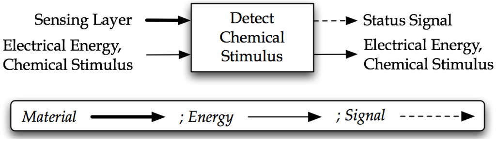 A black box and conceptual functional model of the chemical sensor are needed to satisfy step two of the methodology. The black box model guides the decomposition of the flows into a functional model. The black box model of Figure 2 demonstrates that the overall objective of the design is to detect a chemical stimulus. The decomposed conceptual functional model from the black box and needs mapped to flows is given in Figure 3.