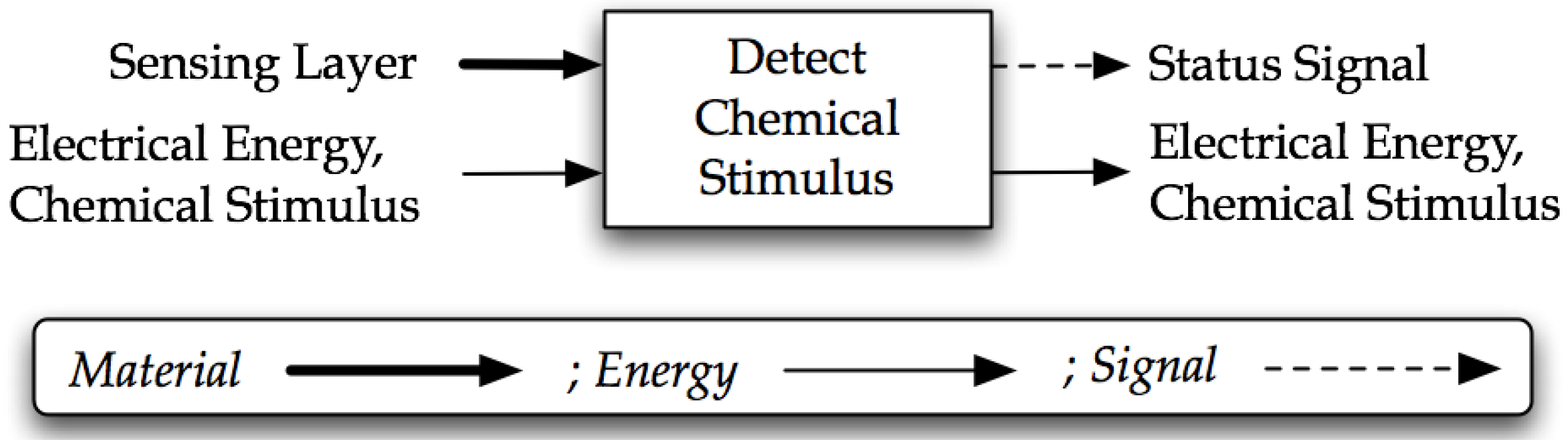| Indirect sensing mechanism | Sensing layer (material)/Chemical stimulus (energy) |