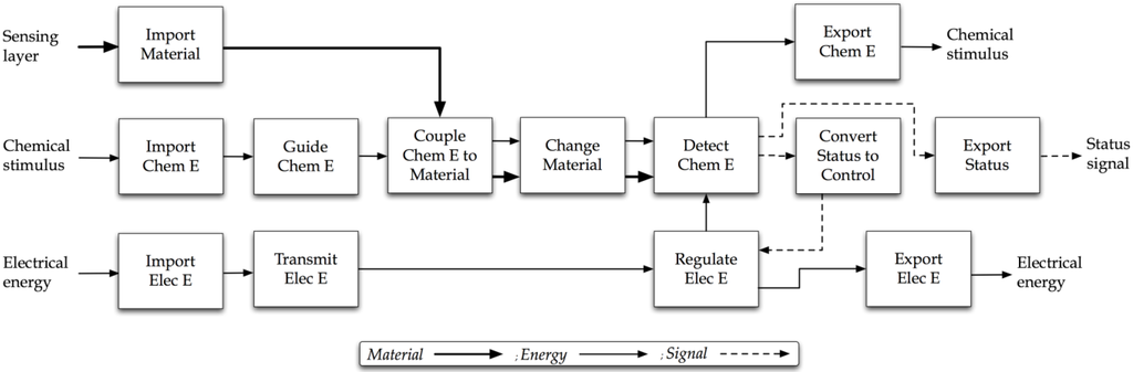 For this design, the needs and constraints of the chemical sensing device are derived from the Handbook of Modern Sensors [22]: selectivity (only senses the desired chemical in the presence of other species), quick response time, reusable, and utilizes an indirect sensing mechanism. These needs and constraints are mapped to flows as shown in Table 2 to complete the first step of the methodology.