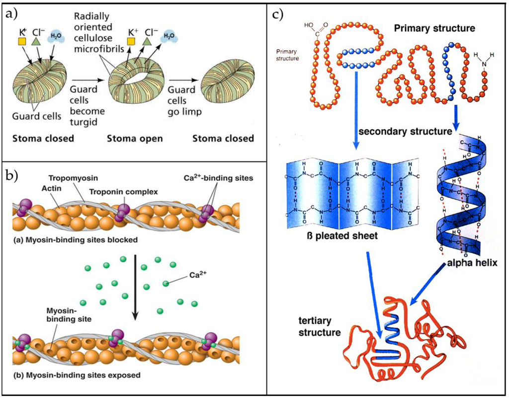 Inspiring biological systems, (a) guard cells, (b) troponin and tropomyosin, (c) silk–protein (Adapted from: (a) [58], (b) [54], (c) [55]).