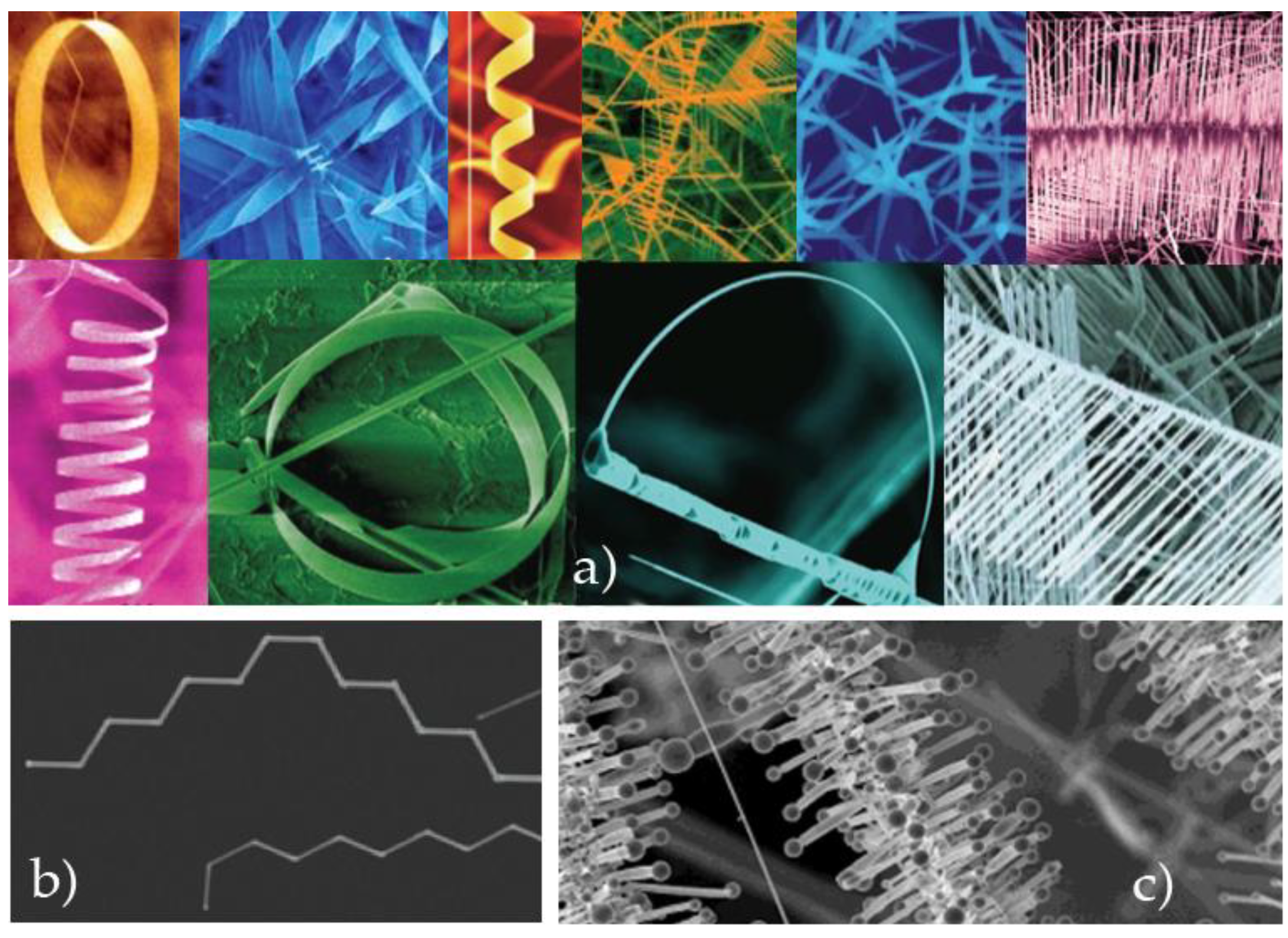 Nano structures for sensing offer many advantages: sensitivity, large surface-to-volume ratio, low power, fast response, fast calibration, surfaces can be functionalized and metal oxides work well at elevated temperatures [64,65,66]. Several morphologies have been created with nanowires as shown in Figure 4. A group of researchers at Georgia Tech University have fabricated nanowires and nanobelts in several shapes: spiral, spring, comb (branches on only one side), ring, propellers (equidistant branches), helix, saw (branches on opposite sides), bows and tetrapoles (Figure 5a) [61,67]. Zig-zig or kinked nanowire structures have also been fabricated (Figure 5b) [68]. Other researches have created ribbons coated with perpendicular branching structures that look like holiday tinsel (Figure 5c) [69].