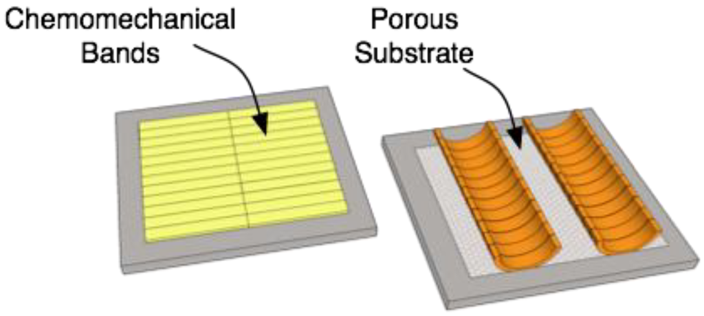 Guard cells (Figure 4a) are modified epidermal cells (cells on the surface of a leaf or other plant tissue where bark is absent) that change shape to open and close pores called stomata. Stomata serve as passageways between the environment and the leaf’s interior. Carbon dioxide can enter and oxygen can leave when stomata are open, which are activated by light and low levels of CO2. A proton pump of potassium and hydrogen ions governs the opening and closing of the guard cell pores. This biological system is analogous to chemomechanical polymers and electroactive polymers that change shape in the presence of a chemical species and electrical current, respectively [59,60].