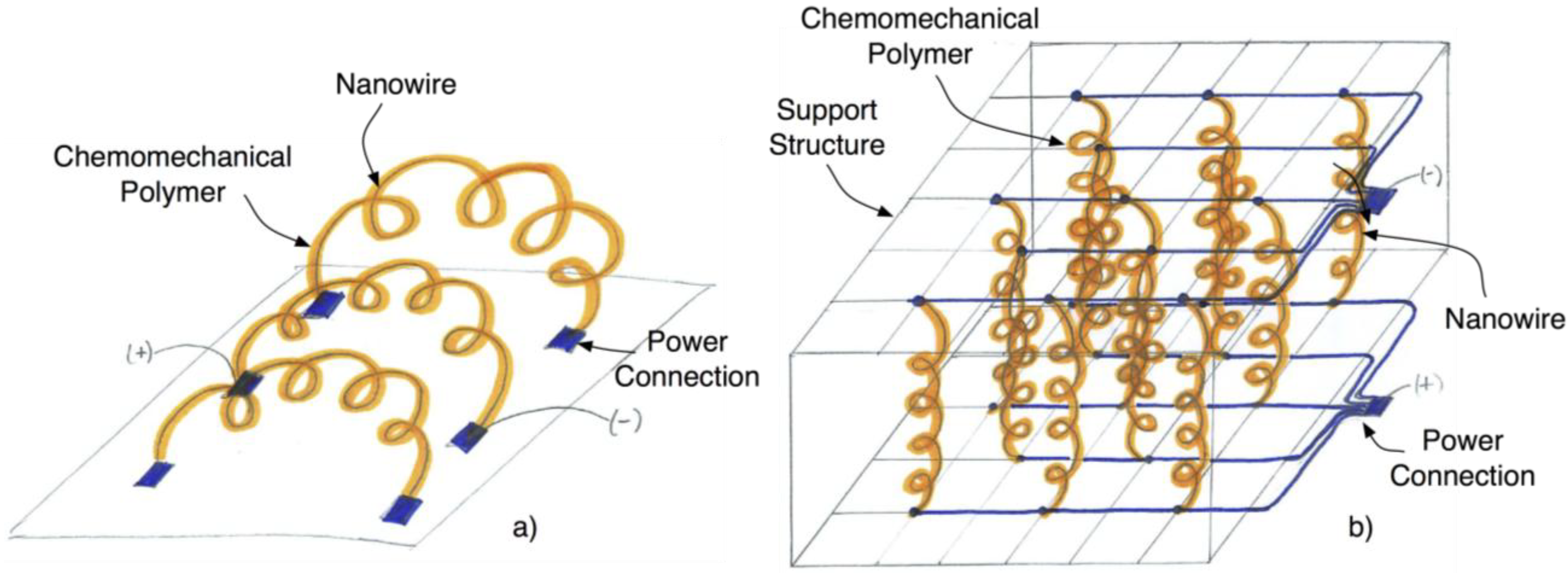 Future work includes quantifying the design parameters for both the chemomechanical polymer and the nanospring to enable prototyping and prototype testing. Investigation of the molecule size of the chemical species of interest is necessary to determine what can and cannot be detected by the chemomechanical polymer as well as threshold limitations. Calculation of the force required to elongate the nanospring structure as well as the spring constant of the structure in relation to the material is necessary to determine the thickness of the polymer needed to produce a change as well as scaling limitations.