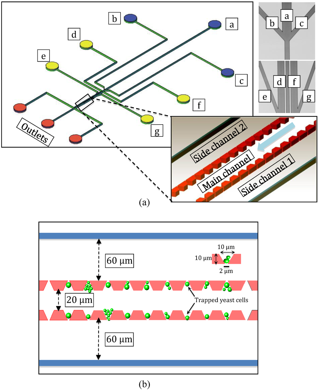 (a) Overview of the microfluidic device with inlets and outlets. Inlets “a”, “b”, and “c” were connected to the main channel and used to inject the cells and stress substances into the device. Inlets “d” and “f” were used as the side inlets for hydrodynamic cell loading and reagent injection into the side channels. Inlets “e” and “g” were sheath flow inlets. Close-up view shows the trapping zone of the device and the flow direction in the main channel. (b) Device dimensions engineered for experiments with yeast cells.