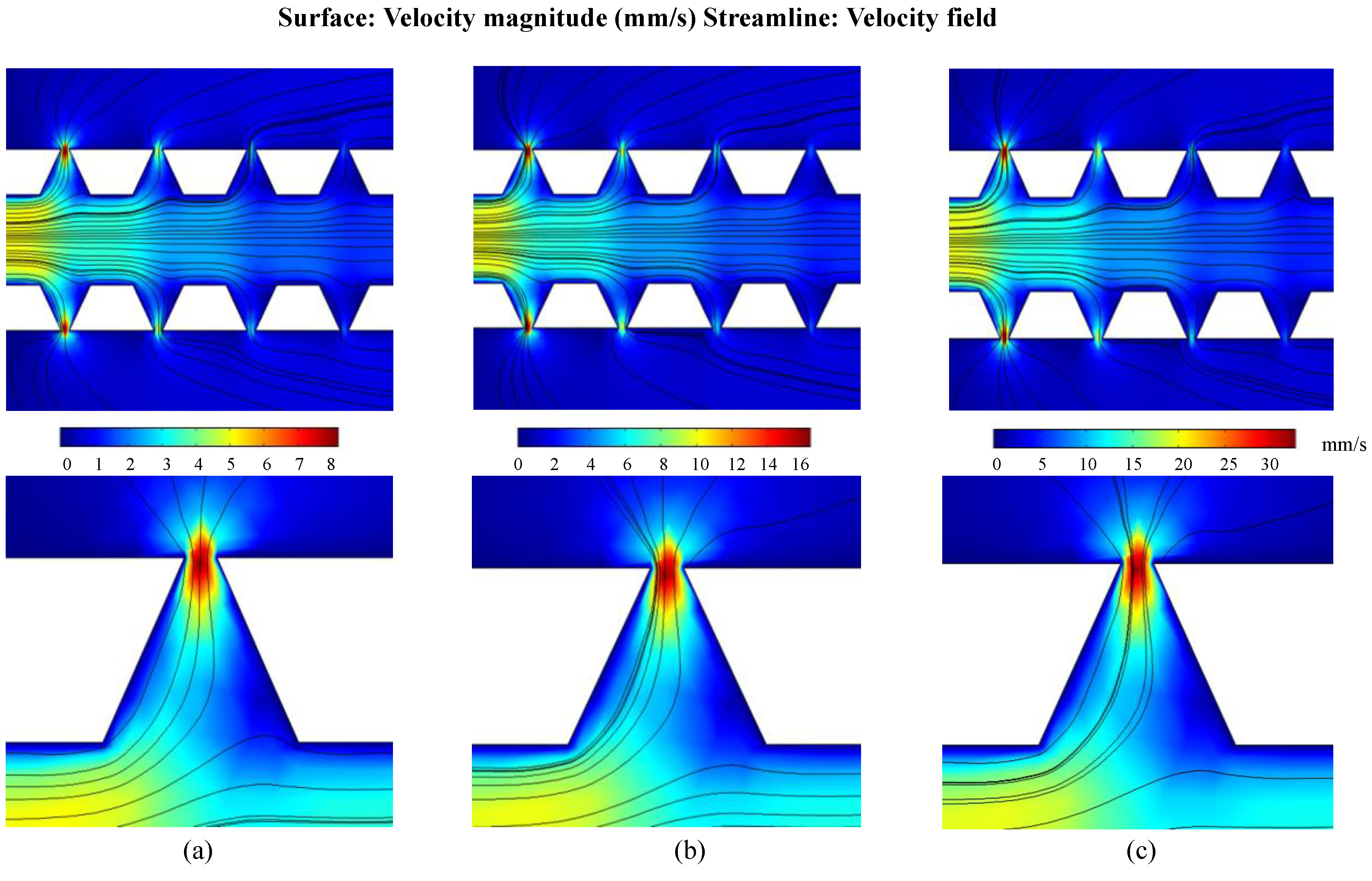 Simulation results for the velocity field under the three different main flow rate conditions. The side flow rates in all cases were kept at 5 nL·min−1. Jet flows were formed at the bottom of the flow nozzles. The flow velocity reached its maximum at the bottom of trap 1 and trap 2 and decreases along the channel due to the partial leakage of the flow to the side channels. Streamlines of the velocity field show the portion of the flow diverged from the main channel to the side channels. (a) The flow rate in the main channel was 25 nL min−1 and the maximum flow velocity was 8.2 mm/s; (b) the flow rate in the main channel was 50 nL min−1 and the maximum flow velocity was 16.4 mm/s; and (c) the flow rate in the main channel was 100 nL·min−1 and the maximum flow velocity was 32.5 mm/s.