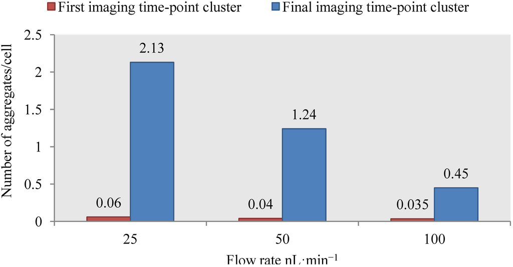 The prepared cell syringes were connected to the inlets “b” and “c” and cells were loaded into the device by several fast pulses of the syringe pumps. As control, we first monitored the cells under the normal condition while YNB was flowed over the trapped cells for 45 min. YNB was infused from inlet “a” in the main channel and the trapping area was scanned and imaged as described earlier. Our data showed no Hsp104-GFP redistribution (aggregate formation) under this experiment condition. To investigate the effect of different arsenite flow rates on the single yeast cells we defined a scenario where we performed separate experiments in separate microfluidic devices. We modulated the stimulus flow rates in the main channel from 100 to 50 nL min−1 and 25 nL min−1 as high, moderate, and low flow rates, respectively. In each case, the cells were exposed to the final concentration of 0.5 mM sodium arsenite. Interestingly, we found that both the time of aggregate formation and the number of aggregates in the studied cells were affected by the change of the flow rates. Our data clearly showed that when the flow rate was decreased from 100 to 25 nL min−1 Hsp104-GFP aggregates appeared earlier and the total number of induced aggregates increased significantly. The uptake of arsenite in the presence of glucose into the yeast cells is mediated by a plasma membrane protein, Fps1 [36]. Fps1 is an aquaglyceroporin and facilitates passive diffusion of arsenite down the concentration gradient into the yeast cells [37,38]. Therefore, it is expected that arsenite passive diffusion occurs more efficiently in the condition of lower flow rate in which cells are in closer and longer contact with the arsenite molecules. Figure 4 demonstrates the comparison of the mean number of aggregates per cell for the three different arsenite flow rates. The values were obtained by averaging the total number of aggregates over the total number of trapped viable cells. Total numbers of aggregates were counted separately in all occupied segments of the device for both the first and last time points. As described earlier in microfluidic system operation, images from subsequent trapping segments were acquired in 30 s time intervals from the adjacent segments. Each imaging time point we have referred to, consisted of images for all occupied segments during one whole scanning of the trapping zone. For example the data shown for the 25 nL min−1 arsenite flow rate was obtained for 12 occupied segments, thus, the first time-point cluster included images taken at time points t = 0–5.5 min. The final time-point cluster included images at time points t = 38–44 min. The ratios are shown for the first and the final time-point clusters of each experiment (Figure 4).