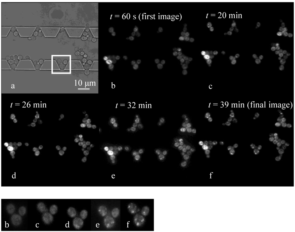Localization of Hsp104-GFP is demonstrated in one field of view of the device under the 25 nL min−1 flow rate condition. As seen in Figure 5, the number of aggregates increased during the experiment time.