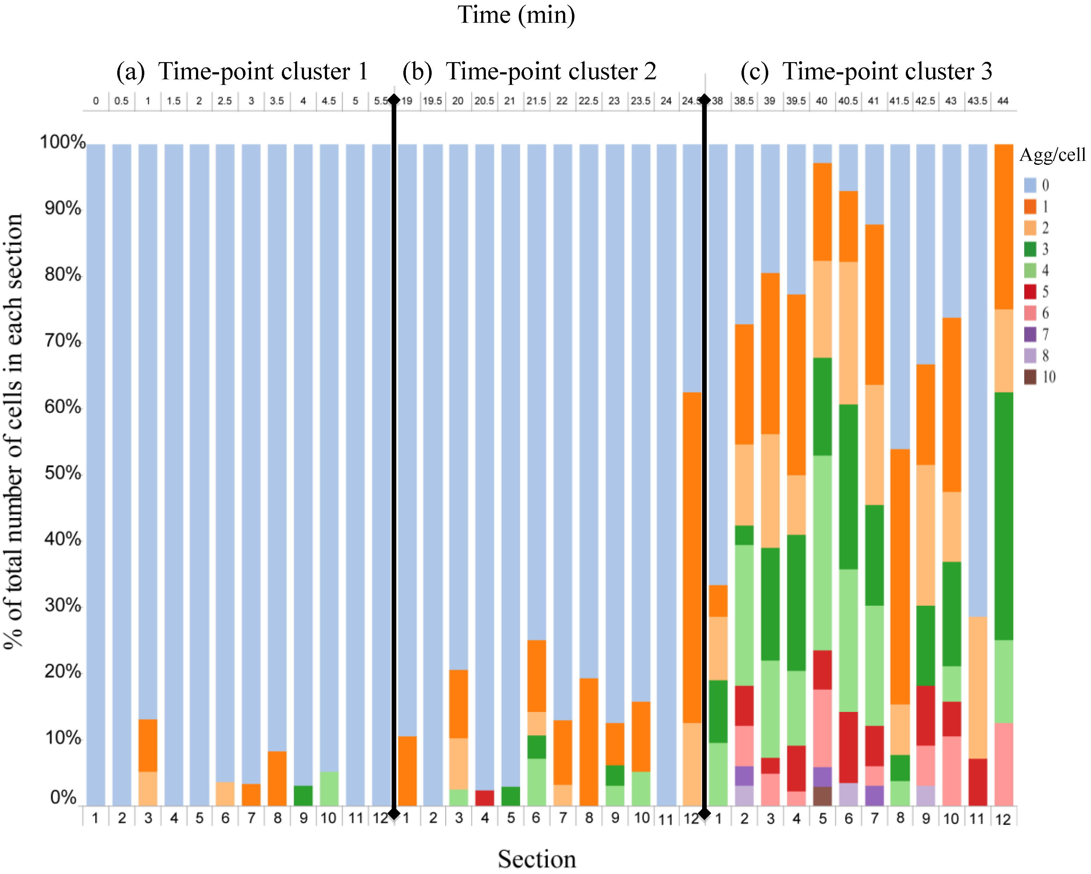 Results are illustrated in Figure 6, with the three time-point clusters being separated by solid black lines. Data is shown for all 12 occupied segments of the device. To increase the readability of the data, individual cells are grouped together based on the number of aggregates. The color bars in the figure denote the percentage out of all trapped cells in each segment having a certain number of aggregates. Monitoring the cellular responses in time revealed that the formation of aggregates in individual cells followed a totally random pattern with some of the cells being disturbed drastically while other groups showing a trivial affection or not responding to the treatment at all. Data also clearly showed an increasing trend in the number of aggregates with time.