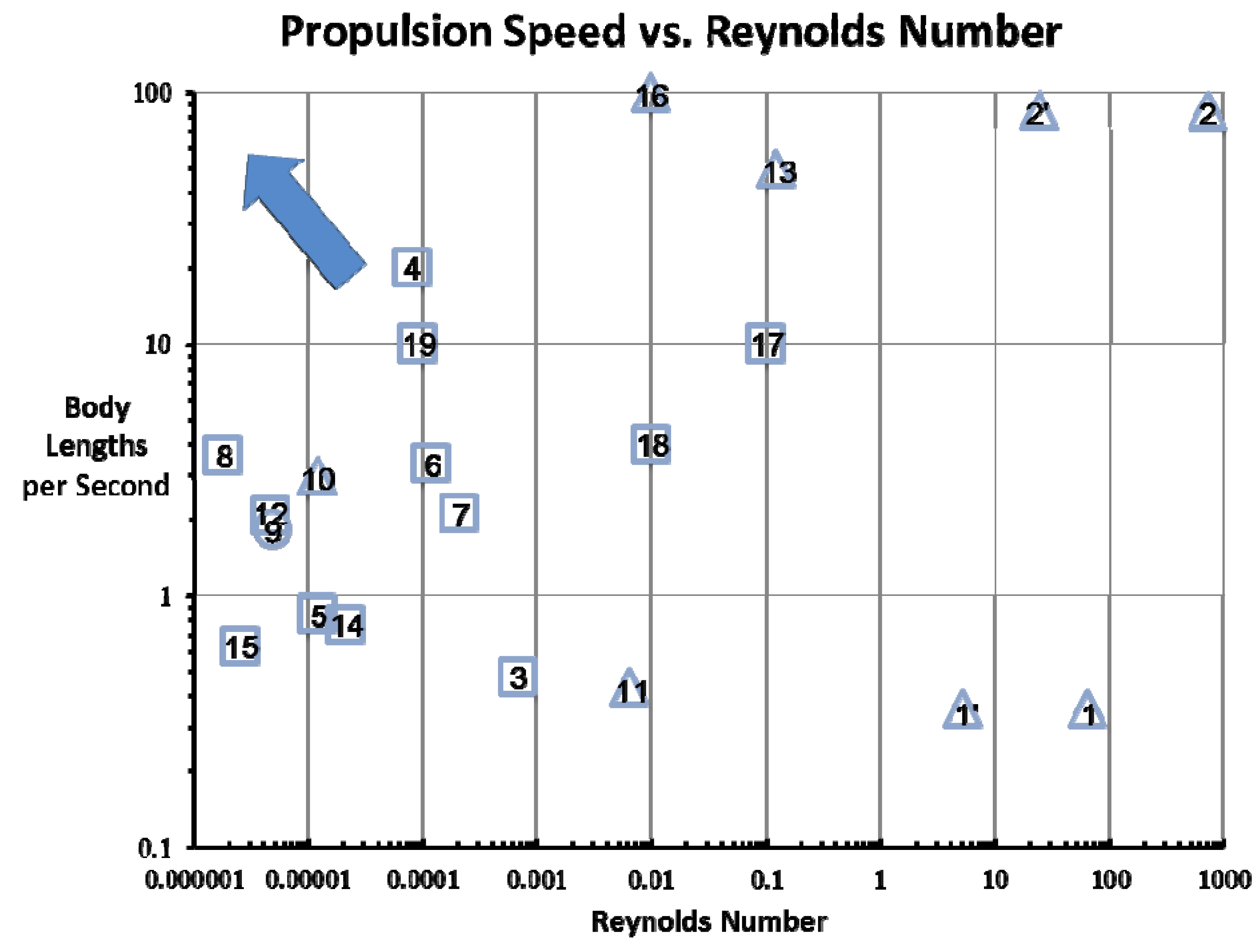 When the dimension of swimming vehicles goes into the micro or nano scale, the propulsion principle is quite different from that of the larger scale. In addition, swimming in such a small scale faces a lot of challenges including spatial and temporal control of the swimming direction and speed [16]. In order to compare a variety of propulsion methods in micro/nano scale, the Reynolds number and propulsion speed are plotted in Figure 2. For reference, the data for some natural micro-organisms are added (Paramecium ~100 μm long, Human spermatozoon ~50 μm long and Escherichia coli ~3 μm long) [17,18]. Some of the fabricated micro devices could swim in the low Reynolds number region (even less than 10−5), which are much smaller than the natural swimmers. In general, however, the natural microorganisms have a relatively faster speed (~10 body lengths per second) than the artificial devices. Currently, almost all the developed propulsion devices do not generate a strong force high enough to propel against strong blood streams such as in aorta, but they can be operated in quiescent or mild flow regions. On the other hand, some swimmers that have a fast speed, for example, device 2 in Figure 2 cannot swim in the very low Reynolds number. The future research direction is expected to turn (i.e., faster propulsion and smaller swimmer) toward the upper-left corner in the Figure 2 (indicated by the arrow).