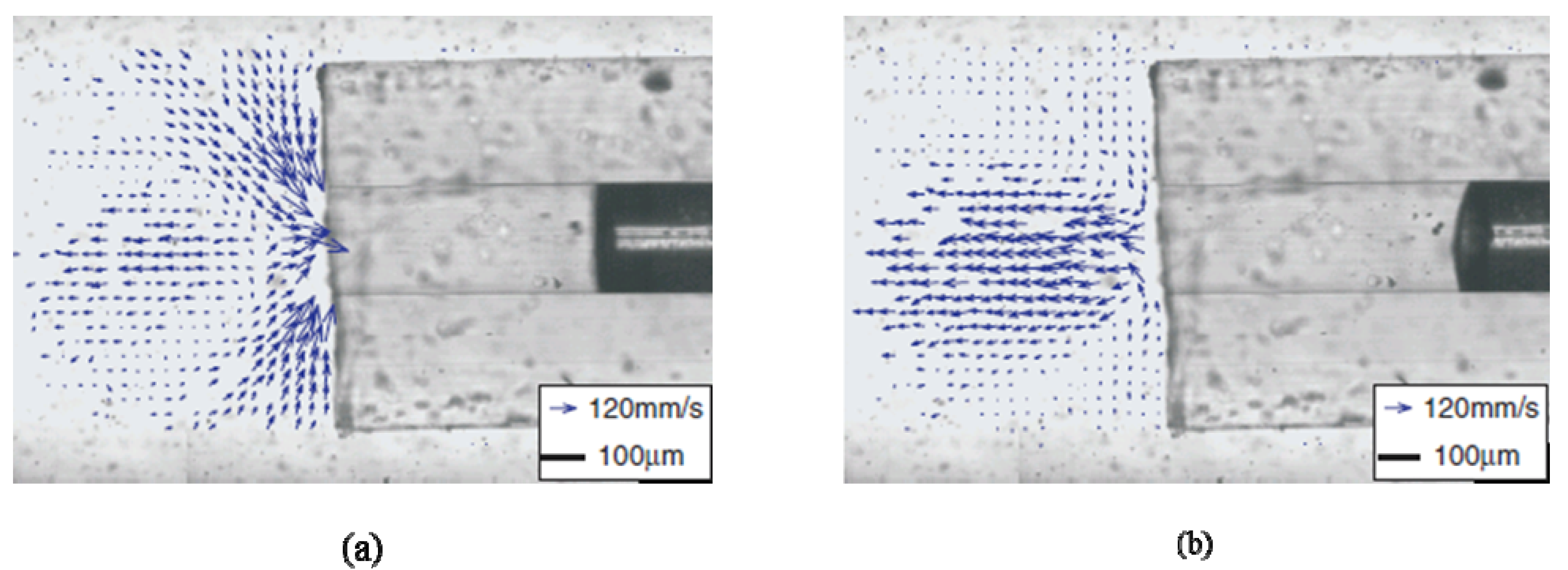 The flow field obtained from particle tracking velocimetry (PTV) at two phases of the acoustic cycle (a) phase 144(intake flow); (b) phase 216(outtake flow) [19].