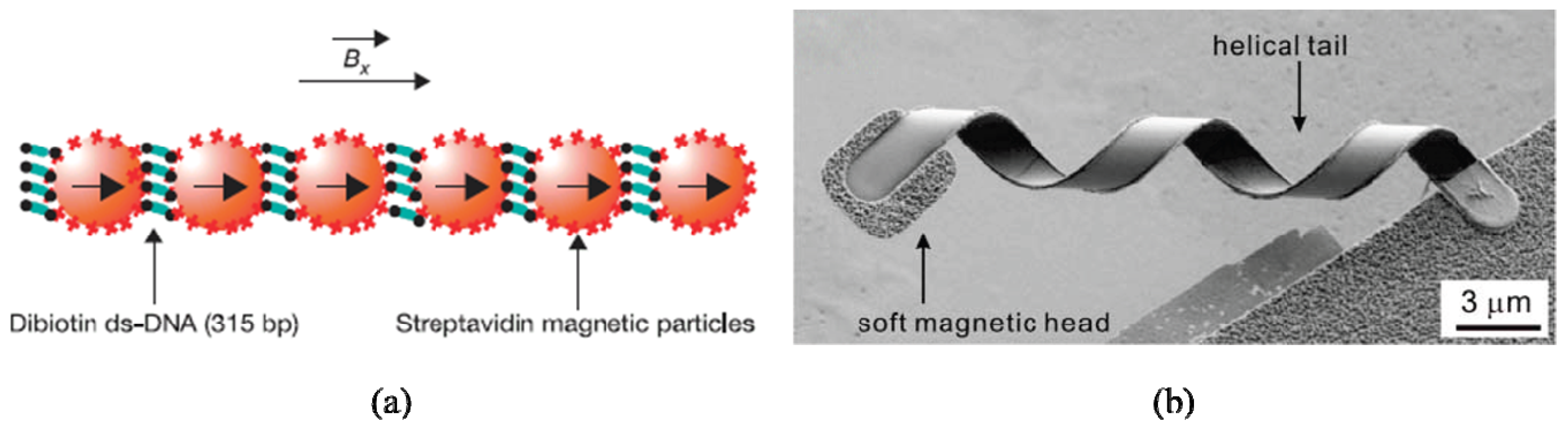 (a) Schematic of a DNA linked flexible magnetic filament [54]; (b) SEM image of ABF with diameter of 2.8 μm [21].