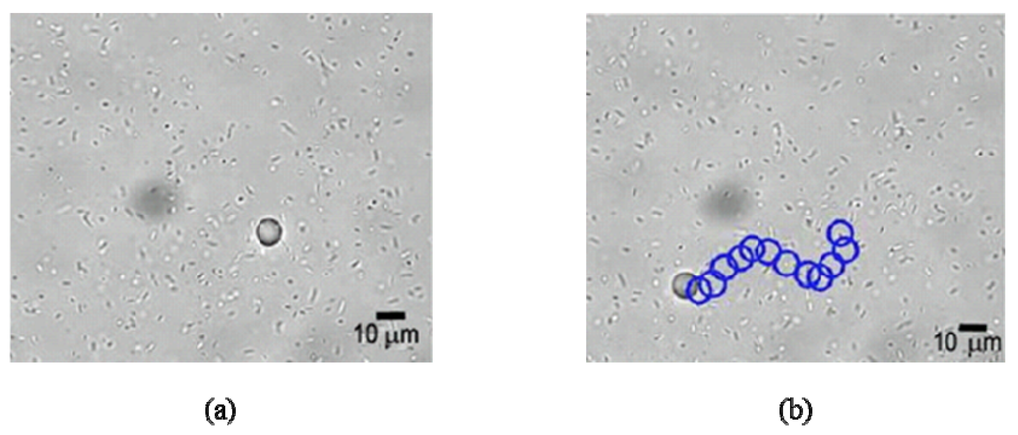 Phase-contrast optical image for the motion of a 10-μm diameter polystyrene bead propelled by S. marcescens bacteria at (a) t = 0 s and (b) t = 6 s [25].