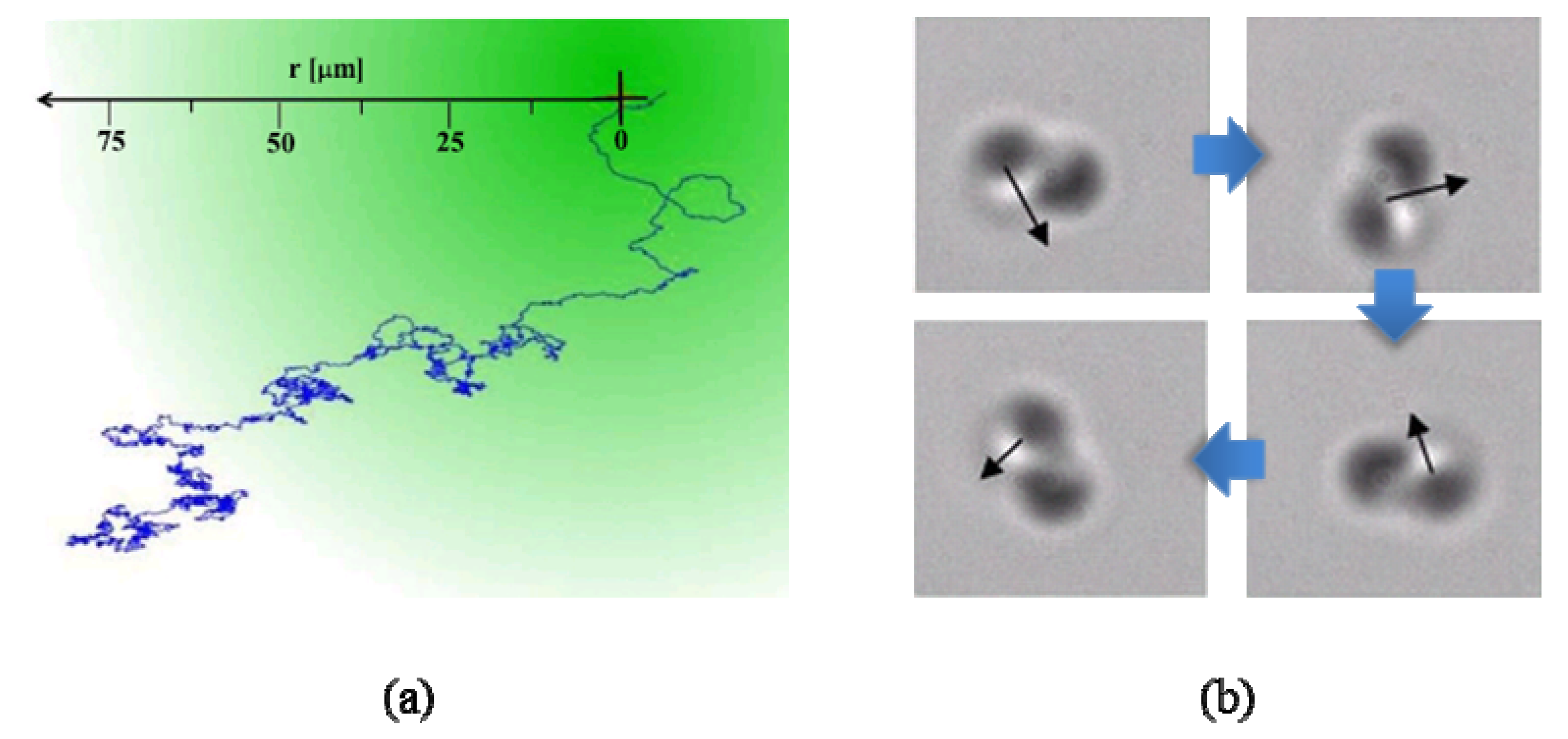 Unlike the Brownian motion in equilibrium, the active Brownian motion breaks the thermal equilibrium resulting in the particle motion or transportation in a controlled direction [69]. Volpe et al. [70] made Janus particles with a gold coating on half of the silica spheres (radius 2.13 μm). When the incident light was absorbed by the golden coating part and, thus, the temperature exceeded the critical temperature, a local de-mixing could occur at the golden cap. This phenomenon would create a concentration difference that propels the particle: that is, an active Brownian motion occurred. The authors studied the swimming behavior of the Janus particles in the patterned surroundings and demonstrated the steering capability with the arranged obstacles. Buttinoni et al. [35] continued this study and showed a good direction control by changing the intensity of the green laser beam, which was used to generate the temperature difference in the Janus particle. The particle moved into the high light intensity area with the speed up to 0.7 μm/s. The trajectory of this particle is shown in Figure 7a.