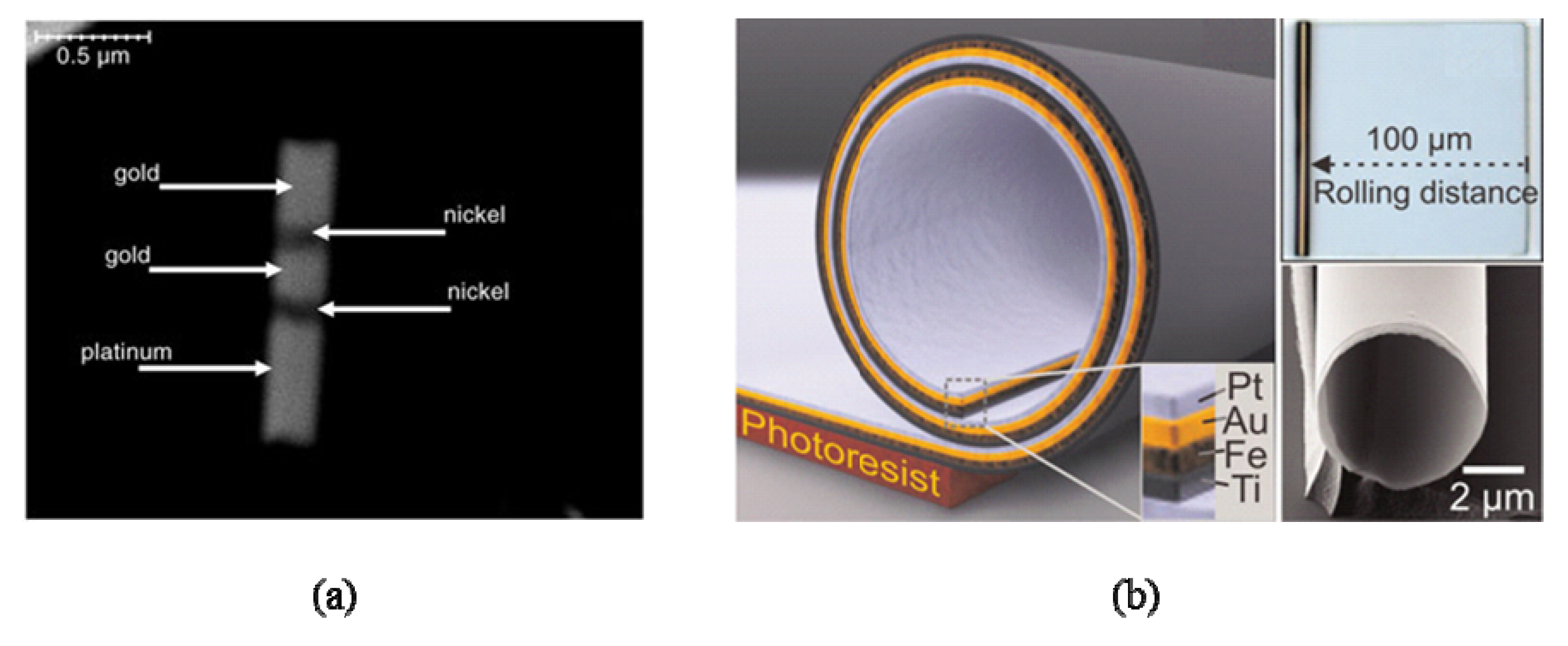 (a) Striped metallic nanorod 1.5 μm × 400 nm [32] and (b) Multi-metallic film for micro jet [30].