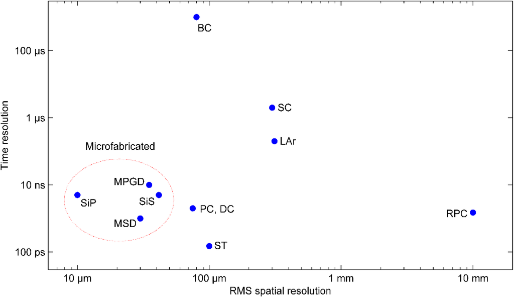 Typical spatial and time resolutions for several particle detector technologies: resistive plate chambers (RPC), streamer chambers (SC), liquid argon drift (LAr), scintillation trackers (ST), bubble chambers (BC), proportional chambers (PC), drift chambers (DC), micropattern gas detectors (MPGD), silicon strips (SiS), silicon pixels (SiP), microfluidic scintillation detectors (MSD). All data from [1] (Table 31.1) except for MSDs.