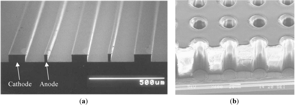 (a) Scanning electron microscope (SEM) image of basic non-planar microstrip gaseous detectors (MSGD) structure on a glass substrate, sectioned with a wafer saw. Alternated gold anode and cathode electrodes are patterned on top of 50 μm thick SU-8 strips. Adapted from [8], with permission. (b) SEM image of a microwell structure consisting in a 55 μm thick SU-8 layer defining the microwells, with an aluminium top cathode, patterned over a Timepix CMOS chip. Reprinted from [9], © 2004 Elsevier.