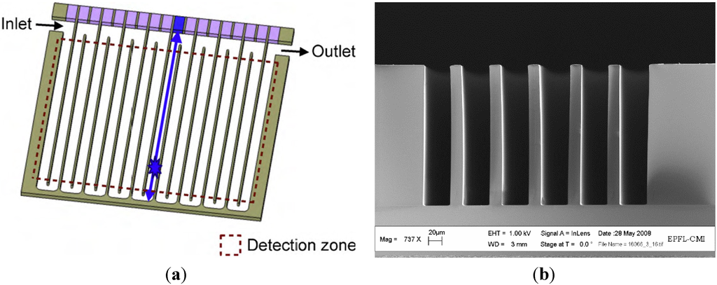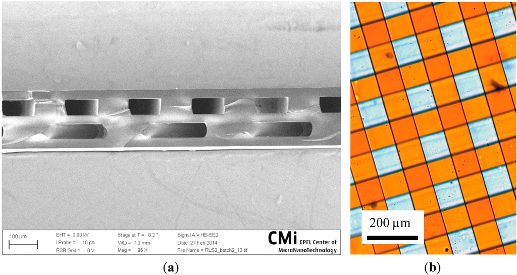 (a) SEM image showing an oblique cross section of the 200 μm thick, monolithic SU-8 chips integrating two microchannel layers. The microchannels are 100 μm wide and 50 μm deep, while the pitch is 200 μm. These dimensions were chosen to match the pixel positions of the Hamamatsu (Hamamatsu, Japan) S8866-128-02 photodiode arrays. (b) Optical micrograph from the top showing the same microchannel network filled with a colorant.