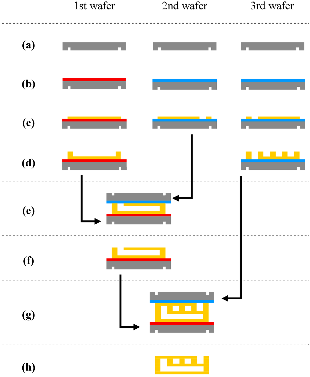 Three silicon wafers were dry-etched to pattern reference alignment marks on the backside (Figure 5a). A 50 nm thick chromium sacrificial film was deposited on the first wafer, while 50 nm of aluminium were used for the other two (Figure 5b). A 30 μm thick SU-8 layer (GM1070 from Gersteltec, Pully, Switzerland) was patterned over the metalized substrates with a standard photolithographic procedure, defining the bottom part of the devices on the chromium-coated wafer while the middle and and top parts of the devices were structured on the aluminium-coated wafers (Figure 5c). A thicker (50 μm) SU-8 layer was then coated on the wafers carrying the bottom and top parts, and patterned to define the microchannel walls for the bottom and top microfluidic layers (Figure 5d). For all these photolithographies, the soft bake, the UV exposure dose, the post-exposure bake temperature and duration, as well as the development steps, were optimised in order to keep into account the high reflectivity of the metallic sacrificial layers and to limit the stress build up. These parameters were found to be important for the success of the subsequent steps, as having overly crosslinked or stressed SU-8 layers would result in respectively bonding failure or warped microstructures after release. The soft bake for both the 30 and 50 μm layers were performed 10 min after the spin coating, by ramping up from 20 to 120 °C in 25 min (4 °C·min−1) then promptly ramping down again to 20 °C at the same rate. Good results could be consistently obtained using an exposure dose of 80 mJ·cm−2, followed by a 40 min bake at 90 °C and 3 min of development in propylene glycol monomethyl ether acetate (PGMEA), for 30 μm thick SU-8 layers. A dose of 120 mJ·cm−2 followed by the same post-exposure bake and 5 min of development in PGMEA were found suitable for 50 μm thick layers. These parameters were also found to be largely independent from the geometrical pattern used. With this choice of thicknesses, all the photolithographic steps could be conveniently grouped in two batches sharing the same exposure and bake conditions, thus limiting the processing time.