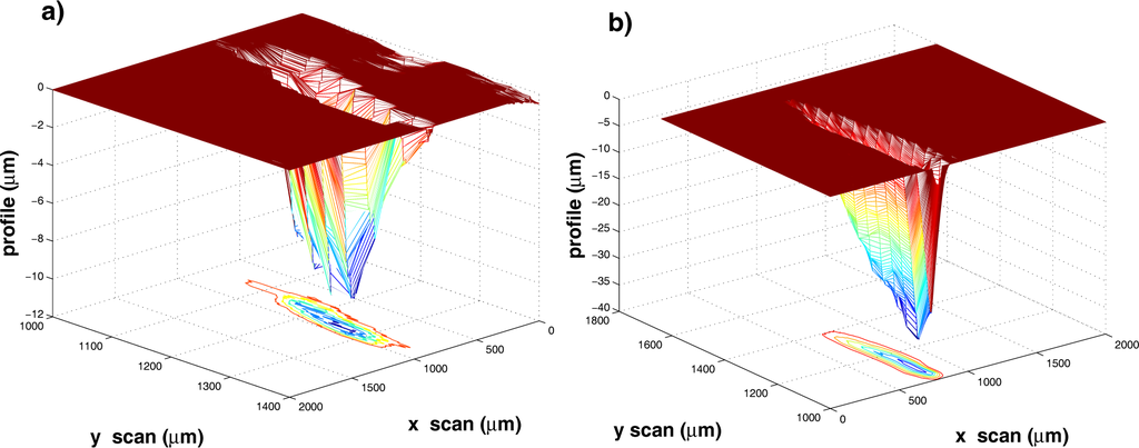 3D representation of the craters produced on the surface of a silver target at 2.0 J·cm−2 by (a) 50 and (b) 200 laser pulses. At the bottom are the corresponding contour plots.