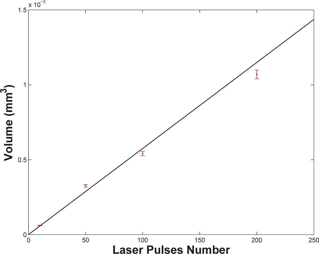 Measurement of crater volume on an irradiated silver target. Data were fitted to the linear relation: M = mpN, M is the total mass removed; the mass and number of silver atoms ablated per single pulse are: mp = 60.0 ng and Nat = 3.35 × 1014 atoms, respectively.