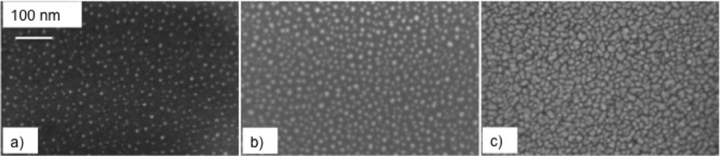 SEM images of the surface morphology of silver samples deposited at 70 Pa of Ar with: (a) 1000, (b) 10,000, and (c) 3 × 104 laser pulse.