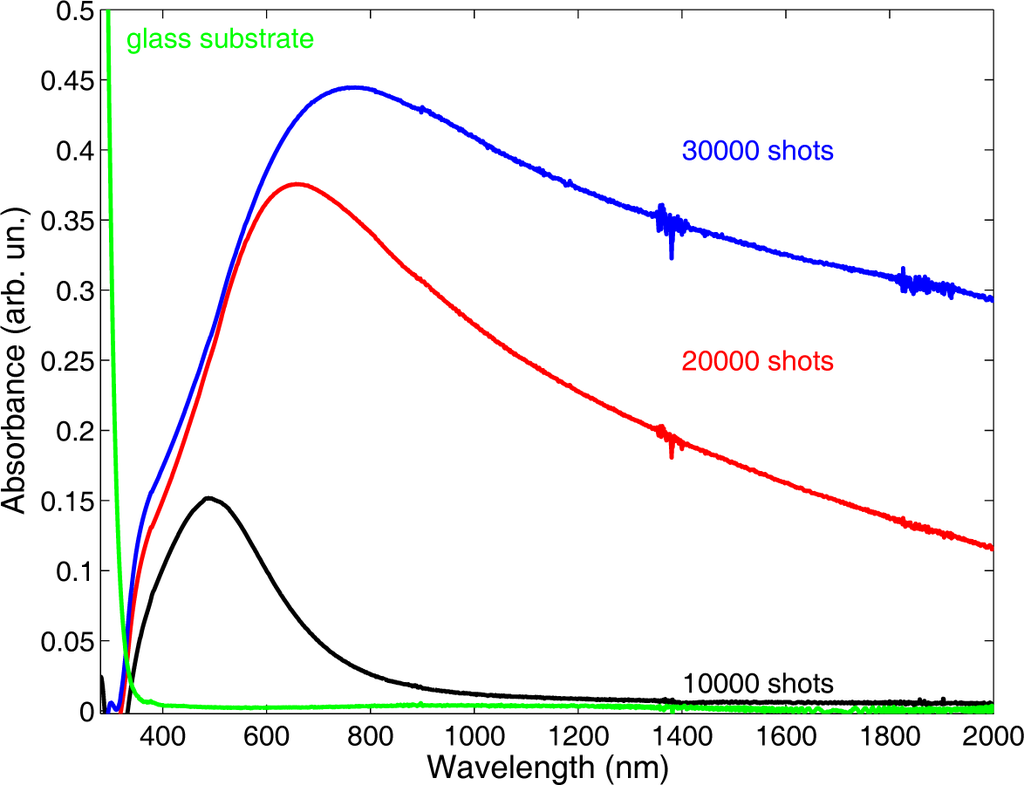 To the different morphologies correspond different optical properties of the films. The trend of the UV-Vis absorption spectra as a function of the different morphologies is shown in Figure 4. Increasing N, keeping fixed all other deposition parameters, a red-shift and a broadening of the FWHM of the LSPR peak is observed. A similar trend of change of the film surface morphology and, hence, of the optical properties of the film is observed if N is kept fixed, while the Ar pressure is changed. The effect of Ar pressure on film properties can be understood if the role of the gas on the expanding plasma is considered. Just after the end of the laser pulse, the ablated material starts to expand through the ambient gas, the expansion dynamics being driven by collisions: in the initial expansion stage, intra-plume collisions are dominant, but soon, collisions between plasma species and gas atoms become more and more effective. The collision rate depends on the gas density ρ and increases with ρ. The higher the collisional rate, the less the amount of material that reaches the substrate. At the same time, a higher collision rate promotes the formation and growth of NPs in the plasma. Such a complex process leads to the observed morphology dependence on N and on ambient gas density []. Thus, it is possible to tailor the optical properties of deposited films through the control of two easily adjustable deposition parameters (laser pulse number and Ar pressure), provided the relevant process parameters, in particular the laser fluence F, are kept fixed. The latter, given by the ratio of the laser pulse energy EL to the irradiated spot area A, can be kept fixed by changing appropriately both EL and A. Fixing F does not ensure that the ablated mass remains fixed as well. If we irradiate a larger area with a higher energy pulse, we can keep constant the fluence value, but a different mp value results. Referring to the above discussion, for expansions through an ambient gas, the interaction with gas atoms depends on the plasma mass. We have investigated this point growing a set of samples by changing mp, still keeping fixed F []. Two Ag samples were grown at 70 Pa of Ar, at dT−S = 35 mm, with 104 laser shots, F = 2.8 J·cm−2. To explore the role of mp, two focusing conditions were chosen, both corresponding to the same F value: E1 =10 mJ, A = 0.011 cm2 and E2 =30 mJ, A = 0.037 cm2. For the two conditions, different mp values result, namely mp1 = 7.0 ng and mp2 = 16.4 ng, as measured according to the procedure outlined in Section 3.1.