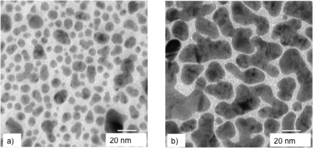 In Figure 5 are shown the TEM pictures of the surface morphology of the two Ag films. The difference between the two morphologies is impressive. The surface of the sample deposited at lower mp1 (7.0 ng) is characterized by the presence both of small, nearly spherical NPs and of larger ones with the shape progressively more and more irregular, up to islands that result from the coalescence of several NPs. Looking at the surface of the sample deposited at higher mp2 (16.4 ng), we see a nearly percolated structure made of larger islands interconnected by a network of channels. In this sense, mp has the same effect on the evolution of sample surface morphology as lowering Ar pressure or increasing the laser pulse number. It is worth outlining that two well-differentiated surface morphologies were obtained adopting the same fluence. Thus, in a report on a PLD experiment, the fluence value is not enough to make it reproducible, if laser pulse energy EL and irradiated area A are not reported, as well, because these two parameters determine mp.