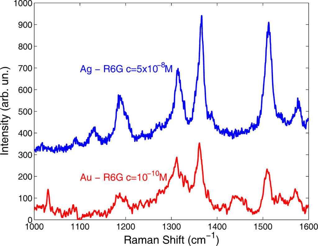 Raman spectra acquired on silver and gold nanostructured substrates soaked in aqueous solutions of R6G at concentrations c = 5 × 10−8 and c = 10−10 M respectively.