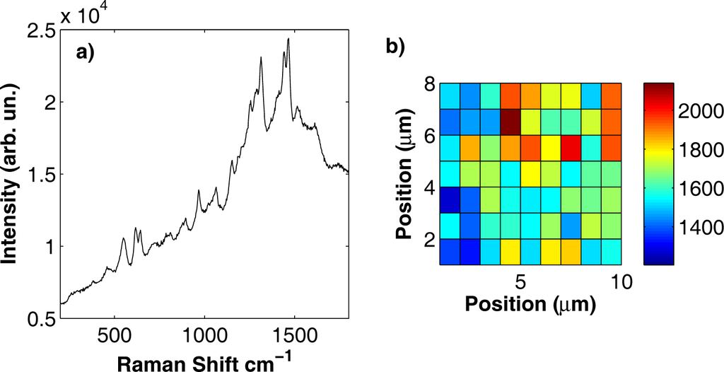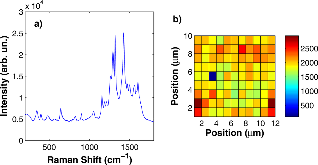 (a) SERS spectrum acquired on a silver substrate soaked in an aqueous solution of alizarine at a concentration c = 10−4 M. (b) Intensity of the Raman peak at 900 cm−1 as a function of the position on the substrate surface over an area of 10 × 12 μm2. Detection point spacing, 1 μm.