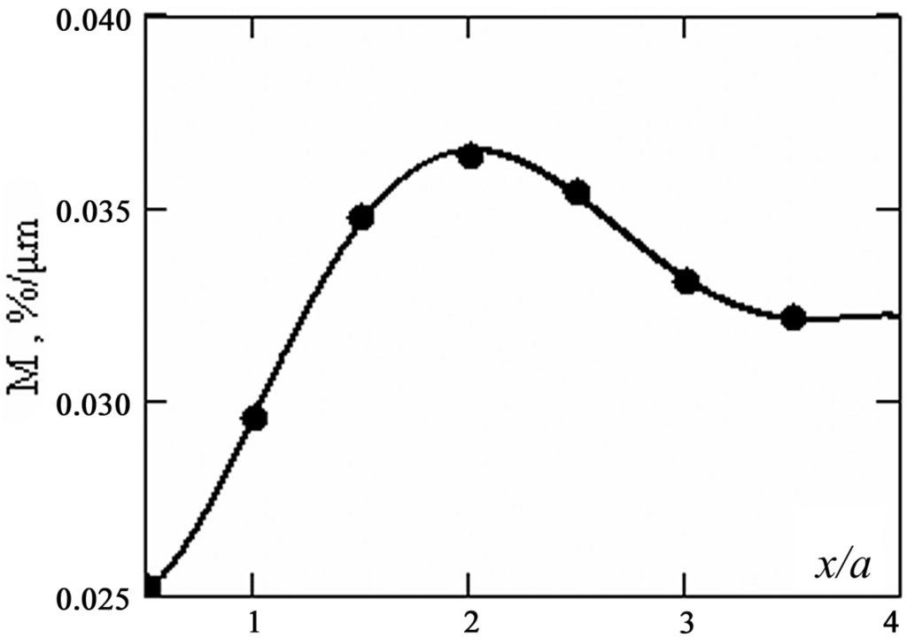 In Figure 2, this is shown by the continuous curve, and the points are calculation data. This dependence is, of course, conventional, as it involves, in particular, the definition of the mixing efficiency.