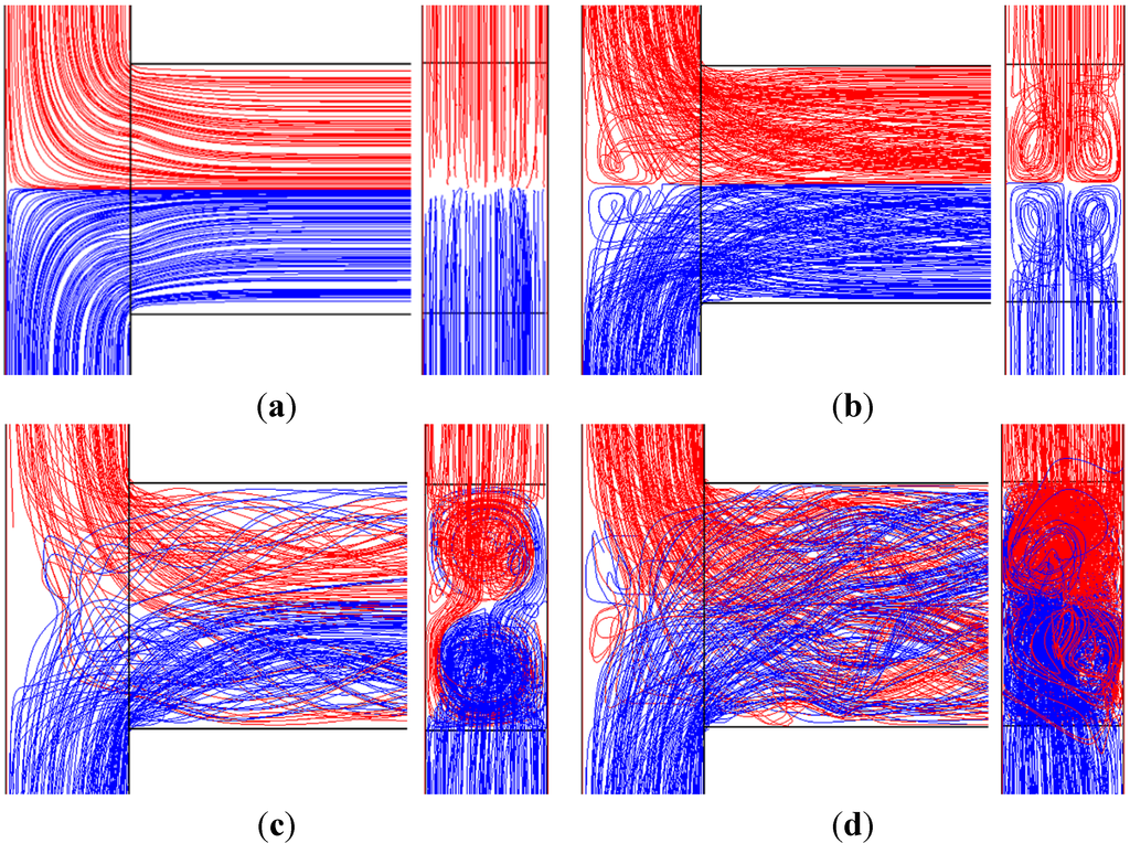 Marker particle trajectories in a T-type micromixer at various Reynolds numbers: (a) Re = 1, (b) Re = 120, (c) Re = 186 and (d) Re = 600.