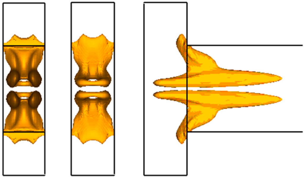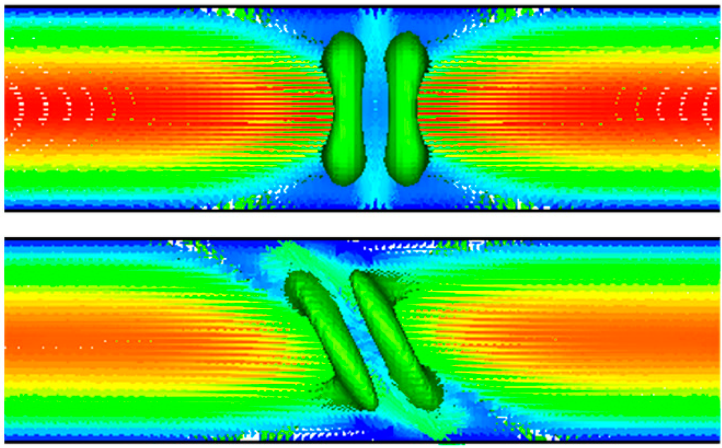 Continuing to increase the Reynolds number, we observe a very interesting change in the flow regime. Starting at a Reynolds number of about 150, the pair of horseshoe vortices abruptly rotates at an angle of 45° about the central longitudinal plane of the mixer, due to the development of Kelvin−Helmholtz instability. This restructuring is clearly seen in Figure 8, where the flow is represented in terms of the isosurface of λ2. Here the top figure corresponds to Re = 120, and the bottom figure to Re = 186 (higher than the critical value at which the restructuring occurs). This flow restructuring is clearly seen in Figure 6c and Figure 7 (see also Figure 5c).