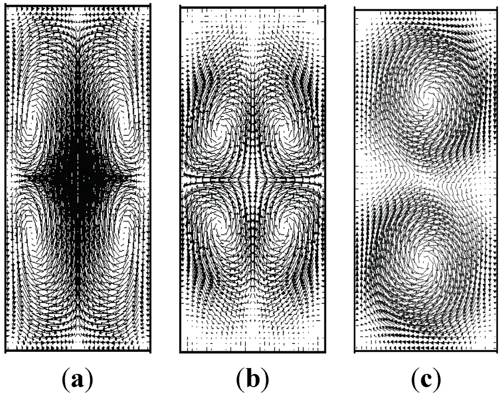 Velocity field in the cross-section of the mixing channel at a distance of 100 μm from the inlet for various Reynolds numbers: (a) Re = 20, (b) Re = 120 and (c) Re = 186.