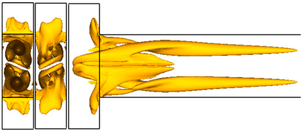 Kelvin–Helmholtz instability leads to the formation of diagonal shear flow in the cross-section of the channel. The center of symmetry of the flow becomes the central longitudinal line through the mixing channel. As a result, instead of four vortices (Figure 7b), as was the case for the symmetric flow regime (Re < 150), two intense vortices with the same direction of vorticity are formed in the cross-section, even at a distance of about 400 μm from the inlet of the mixing channel (Figure 7c). The flow has an S-shaped vortex structure, which is especially clearly seen at the left in Figure 9. Here, mixing is shown by dye concentration isolines in four cross-sections of the mixer. The first section on the left is located at the inlet of the mixing channel, the second at a distance of 100 μm from the inlet, the third at a distance of 200 μm and the fourth at 400 μm. In the Figure, the red color corresponds to pure water, and the blue color to water dyed with rhodamine. This flow regime is also steady and is observed up to a Reynolds number of 240. The structure of this flow is illustrated in Figure 10, where the flow developing in the mixing channel at Re = 186 is shown in terms of the λ2-isosurface.