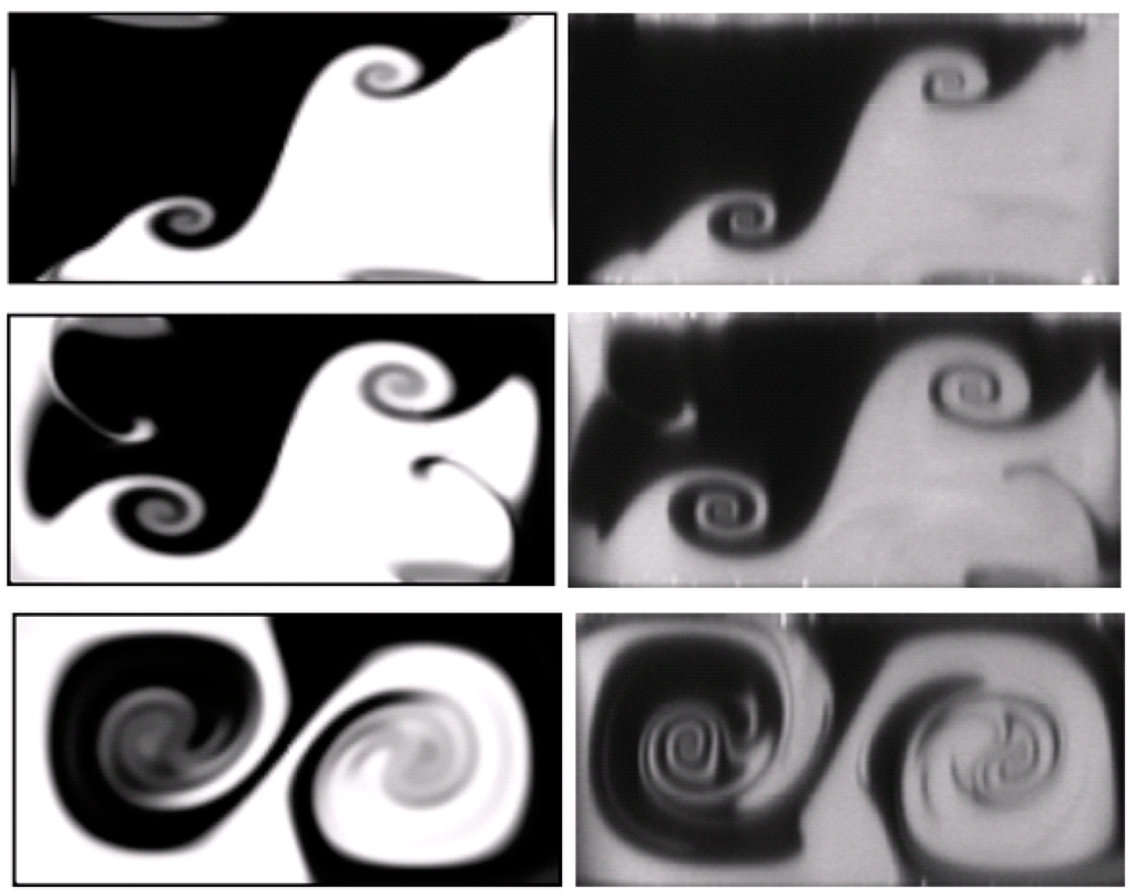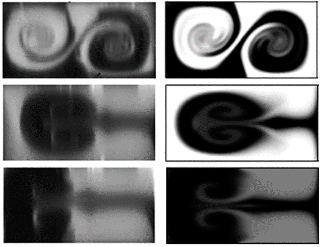 Qualitative comparison of the mixing regime obtained in experiment [11] (left) with calculated data (right) at a Reynolds number Re = 186 and various flow rate ratios: (top) Q1/Q2 = 1, (middle) Q1/Q2 = 1/2 and (bottom) Q1/Q2 = 1/3.