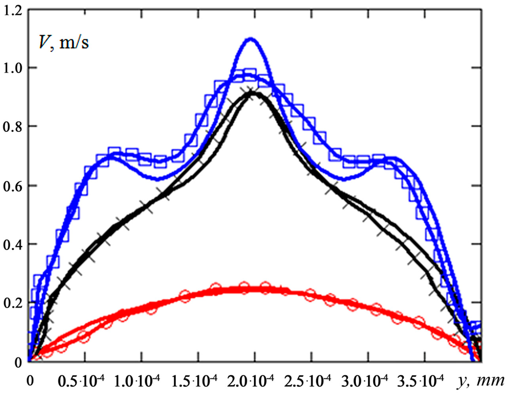 In order to correctly interpret the data of micro-LIF measurements and compare them with simulation results, it is necessary to estimate the spatial resolution of the method. In this work, as shown in [23,39], the average diameter of spatial averaging was 55 μm. Comparison of the concentration fields obtained by numerical simulation and experiment was performed after spatial averaging over the depth of the T-mixer. This comparison is shown in Figure 24. The profiles were obtained in the central section at a distance of 2.5 calibers from the mixing channel entrance. Here, the data points connected by lines are experimental data, and the solid line without data points is the result of numerical simulation. Circles correspond to Reynolds number Re = 30, crosses to Re = 120 and squares to Re = 150. In all cases, the experimental data agree fairly well with the simulation results, but at the maximum Reynolds numbers, the resolution of the interpretation of the experimental data (which is defined by the correlation depth) is not sufficient to adequately describe the complex behavior of the velocity profile involving the formation of S-shaped structures. Numerical simulation turns out to be more accurate.