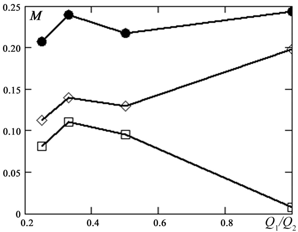 Curves of the mixing efficiency versus asymmetry in the inlet flow rate for various Reynolds numbers are presented in Figure 29. The behavior of the curves greatly depends on the Reynolds number. For a Reynolds number Re = 120 (lower curve), asymmetry in the inlet conditions provides a significant (factor of 15) enhancement of the mixing. Maximum mixing efficiency is observed at Q1/Q2 = 1/3. At Reynolds numbers greater than 150, at which an S-shaped vortex structure is formed in the channel, the presence of artificially asymmetry leads to the destruction of this structure and worsening of the mixing performance.