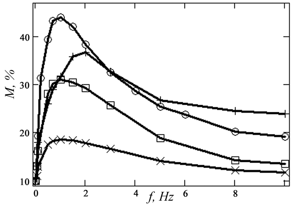 The parameters in Expression (11) are generally determined by the characteristic dimensions of the channel where mixing occurs and flow characteristics (Reynolds and Péclet numbers). It is clear that if the characteristic mixing time is much shorter than the period of change in the flow rate τm << (2πf)−1 = Tf, the mixing efficiency will change little compared to steady mixing. Therefore, the most preferred situation is one in which τm >> Tf. On the other hand, the period of change in the flow rate should be shorter than the characteristic flow time Tf < τL. Of course, producing high-frequency fluctuations in microchannels is technologically difficult. Therefore, the most reasonable situation is one in which τm ≥ (2πf)−1. The optimal fluctuation amplitude can be easily estimated by considering the volume of mixing fluid for the period Tf.