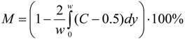 where w = 300 μm is the width of the channel in which the mixing occurs (see Figure 1) and C is the dye concentration in the section at a distance of 4000 μm from the site of merging of the flows. This dependence is well described by the formula: