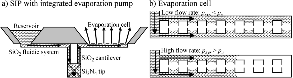 Evaporation-induced pumping represents a straightforward implementation of a micropump into an SPM-based nanopipette. The implementation of such a pump does not require any additional fabrication steps. Only the geometry of the capillary outlet area needs to be increased to enhance the evaporation thus inducing pumping. The working principle of an evaporation induced pump integrated in a SIP is exemplarily explained in Figure 4a [95]. A water-based solution was filled into the inlet (reservoir). Capillary forces instantaneously filled the hydrophilic SiO2 fluidic system and the hollow cantilever. Once the fluid has reached the specially shaped capillary outlet (the evaporation cell), it started evaporating. The evaporation cell is designed such that the capillary is spread into a manifold of top open capillaries. This increased the liquid air surface area, and hence, increased the evaporation. The capillary pressure kept the evaporation cell capillaries wet, and thereby, replaced autonomously the evaporation loss by drawing additional water through the capillaries. The increase of the evaporation area at the outlet results in an increased pumping flow, which also increases the pressure drop between inlet and outlet. As a result, two different flow regimes were considered as sketched in Figure 4b. In the low flow regime, the pressure drop between inlet and outlet is lower than the capillary pressure of the top open channels in the evaporation cell. Hence, all capillaries remained wet and the flow was determined by evaporation rate only. In the high flow regime, the pressure drop between the inlet and outlet, induced by the hydraulic resistance of the fluidic system and the high flow rate, exceeded the capillary pressure of the top opened capillaries. Hence, the evaporation cell was only partially filled and the capillary pressure in the outlet limited the flow rate.