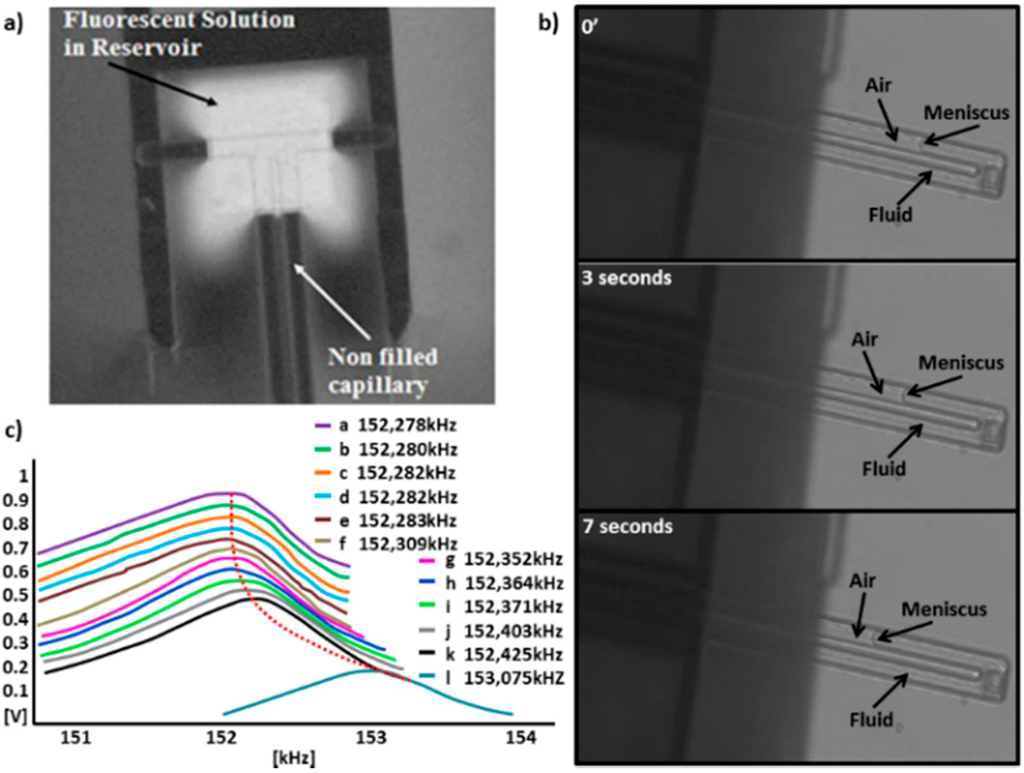 All other probes discussed in this review have fluid storage reservoir connected directly to the aperture at the tip from where the dispensing happens. The hydrophilic nature of the channels allows self-filling of the cantilevers with ink due to capillarity once a tiny droplet is loaded in the reservoir. However, if the cantilevers are left in the air after fabrication, even surfaces like silicon-dioxide or silicon-nitride become slightly hydrophobic. This happens due to the physisorption of hydrocarbons present in the air inside the hollow cantilever surface. This could be, momentarily solved by cleaning in oxygen plasma or piranha-solution, which makes these channels hydrophilic again. The channels would become hydrophobic again within few minutes when left in the air. If that happens, the liquid has to be driven into the channel using pumps. Furthermore, pumping of liquid is also needed if the hollow cantilevers are used for aspirating liquids or when operated in a liquid environment.