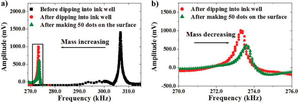 In DPN technique, the cantilever tip was inked with the molecules to be dispensed. External reservoirs of liquids were kept very close to the cantilever for quick and easy access when dipping the tip into them. However, this method of dipping gave an uncontrolled loading of the tip, leading to irreproducible deposition results. Depositing defined amount of droplets on the tip by inkjet spotting solved this problem [98]. The time spent during inking the tip was dead time for the spotting process.