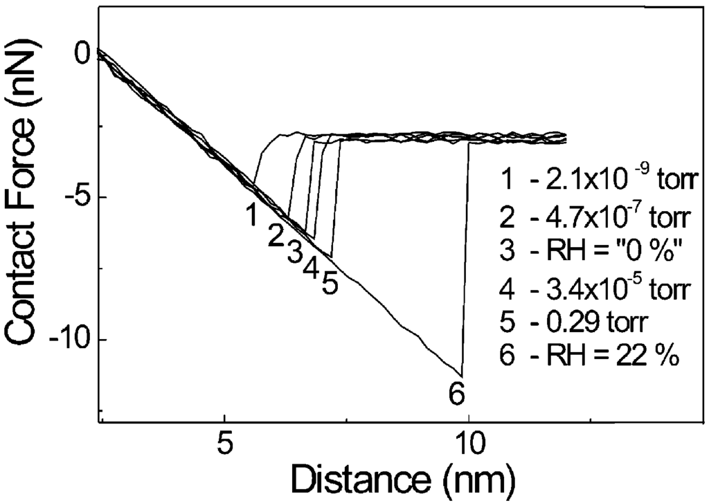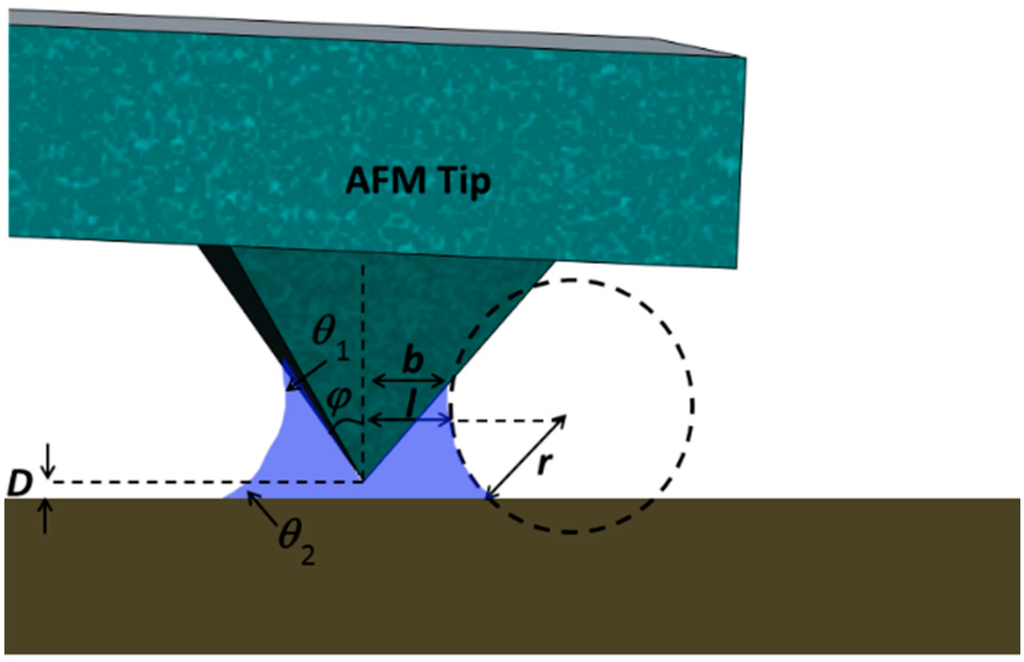 - Rozhok, S.; Sun, P.; Piner, R.; Lieberman, M.; Mirkin, C.A. AFM study of water meniscus formation between an AFM tip and NaCl substrate. J. Phys. Chem. B 2004, 108, 7814–7819. [Google Scholar] [CrossRef]