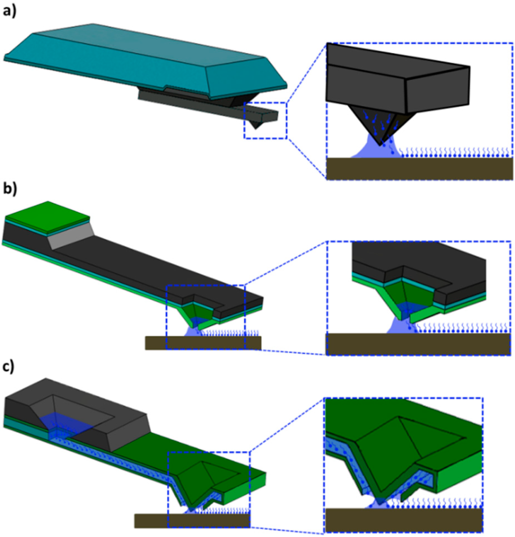 In addition to AFM-based devices, there are also other nanoscale fluid handling systems like Nanofountain Pen (NFPen), Scanning ion conductance microscope (SICM) and Bioplume that are classified in Table 2 and discussed subsequently. Other microfluidic devices like scanning electrochemical cell microscopy (SECCM) and microfluidic Probe (MFP) were also developed. The details of these devices are not discussed in this review.