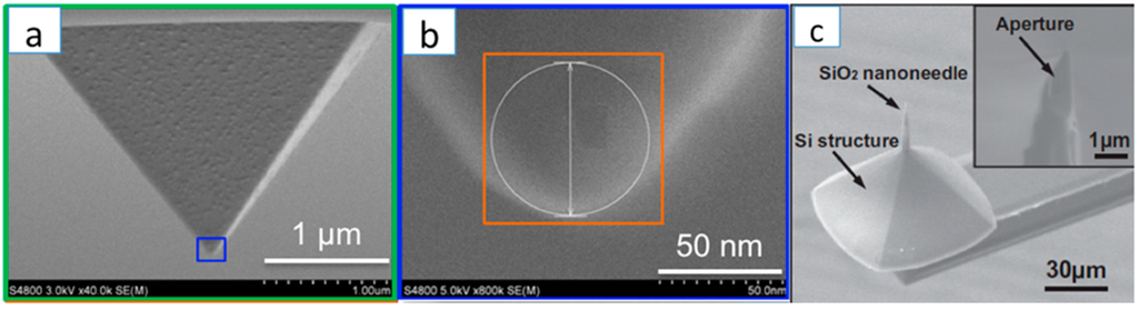 The microfabrication of the NADIS was based on a molding process, combined with anisotropic KOH silicon etching. It begins with a photoresist masking for creating the tip by photolithography on a silicon wafer that was previously thermally oxidized. The wafer was etched by reactive ion etching (RIE) to remove the unprotected SiO2 layer, and the remaining photoresist was stripped-away. Then the wafer was etched in KOH solution. The etching followed the (1,1,1) planes of the silicon, forming a pyramid below the SiO2 layer that was eventually removed. Once the pyramid was formed, the wafer was again thermally oxidized (oxide thickness of ~50 nm) and a low stress low-pressure chemical vapor deposition (LPCVD) silicon nitride (Si3N4) layer of 1 μm was deposited (see Figure 3, Column 1a), which created a mold of the oxidized pyramid. A spin-coated thick layer of photoresist left the apex of the newly formed uncovered tip and the resist was patterned through photolithography to define the cantilever shape. RIE was then used to open the nitride and dioxide layers that were uncovered by the resist. As a result, the tip apex was etched without any lithography step as shown in Figure 3, Column 1b. After stripping the resist, the wafer was dipped in the buffered hydrofluoric acid (BHF) oxide etch, which transferred the opening in the Si3N4 layer into the underlying SiO2 layer. Therefore, the silicon core of the tip was etched by dipping the wafer once again in KOH (see Figure 3, Column 1c). Photolithography on the backside of the wafer was employed to open a window in Si3N4 and SiO2 layers over the future cantilever area by means of RIE (see Figure 3, Column 1d). This allowed the formation of a membrane in KOH underneath the cantilever. A subsequent photolithography and RIE step were used to pattern the front side Si3N4 layer in order to define the cantilever. Finally, the cantilever was released and the hole underneath the tip was finalized by KOH etching as shown in Figure 3, Column 1e.