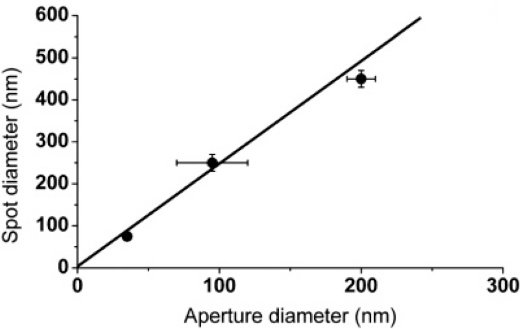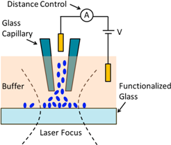 An additional technique for transporting liquid from the aperture to the substrate could be performed with these probes. Liquid droplets could be ejected or sprayed to the substrate by applying an electric field between reservoir and substrate. Without any water meniscus involved in this process, atto to zeptolitre volume droplets were deposited by varying the duration time, amplitude, and polarity of the applied voltage [57]. Similar to DPN, the major limitation of this method is the lack of liquid aspiration capability.