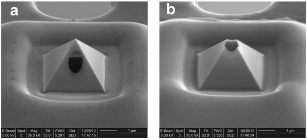 In the NADIS technique, a hollow tip to be used as a reservoir has been fabricated for increasing the storage of liquid on the cantilever (Table 1, item b). An aperture outlet hole was milled at the tip apex for dispensing [22]. The ink was placed as a droplet inside the hollow tip. The capillary forces held the liquid. Once the tip touched the sample surface, a meniscus was shaped around the outlet hole. Receding the tip from the sample surface broke the meniscus and left a droplet of ink behind. Like in the DPN technique, the environmental conditions were controlled. Less volatile inks were used to prevent evaporation, especially, from the large ink-air interface at the hollow tip. The evaporation of the solvent had also a strong influence on the dimensions of the meniscus around the aperture hole. Furthermore, the printing conditions changed over time due to evaporation of the ink’s solvent. This resulted in an increasing concentration of dissolved dispensing molecules. Writing experiments were performed with glycerol on a polished silicon wafer with a native silicon dioxide layer on top. Ink volumes of 40 aL were dispensed in 0.5 s. A single filling of the NADIS probe was able to dispense more than 1000 of such droplets [55,56].
