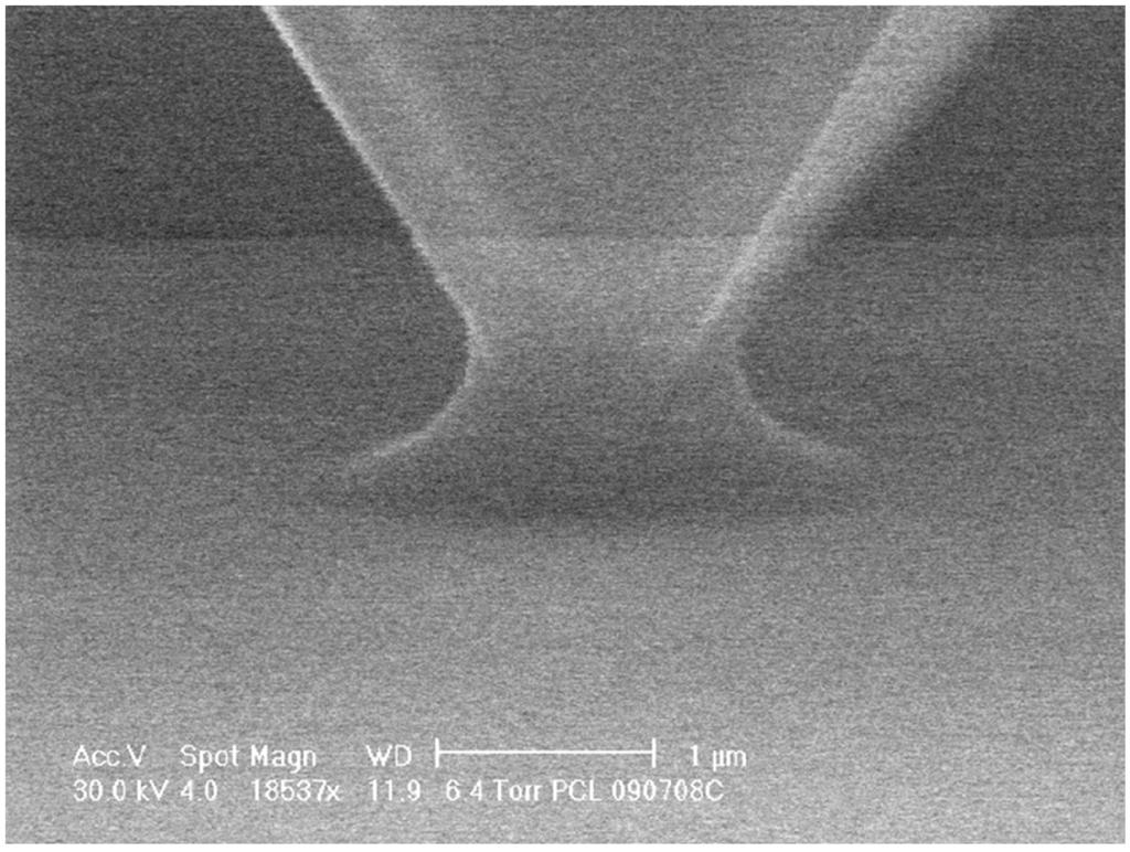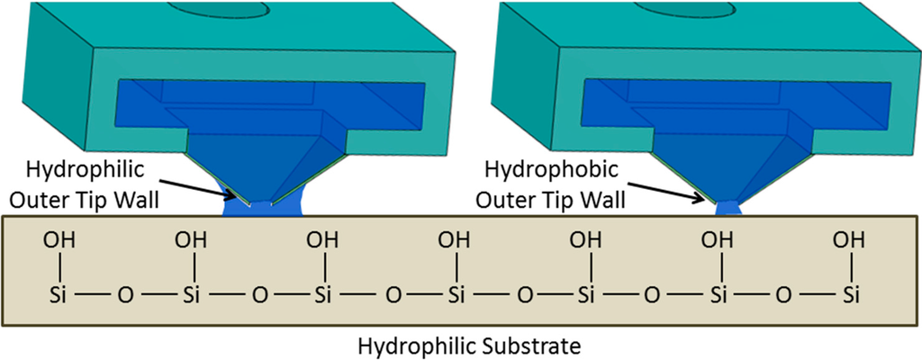 The hollow probe tip, which was used as an ink reservoir, allowed extended writing times compared to DPN technique. The principle of liquid transport from the aperture to the substrate was still via water meniscus.