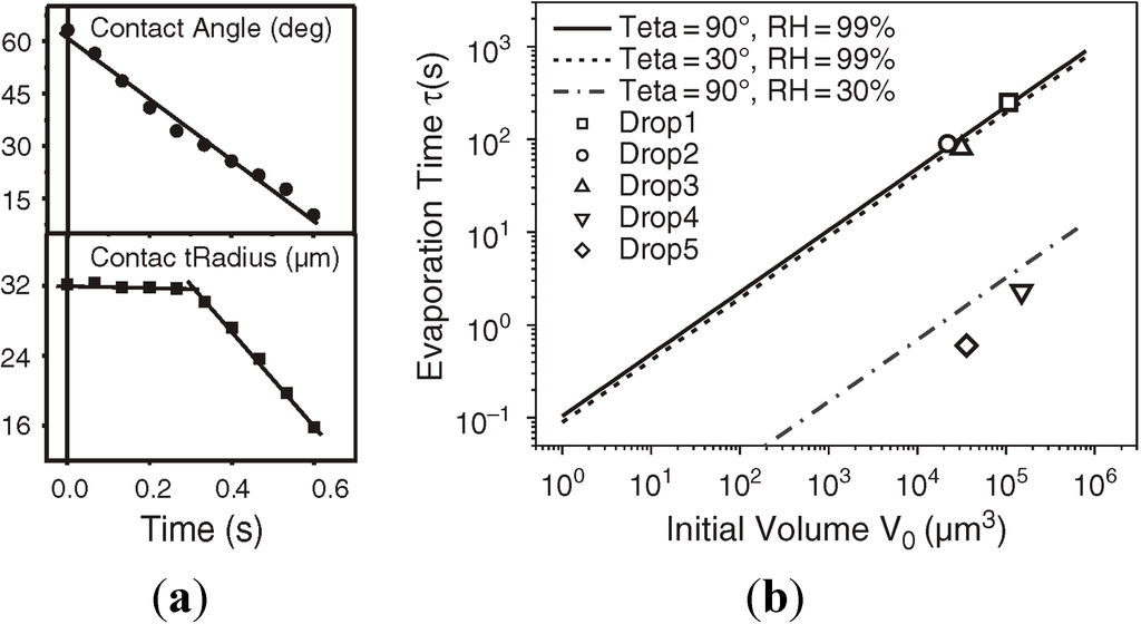 - Schonfeld, F.; Graf, K.; Hardt, S.; Butt, H.J. Evaporation dynamics of sessile liquid drops in still air with constant contact radius. Int. J. Heat Mass Transf. 2008, 51, 3696–3699. [Google Scholar] [CrossRef]